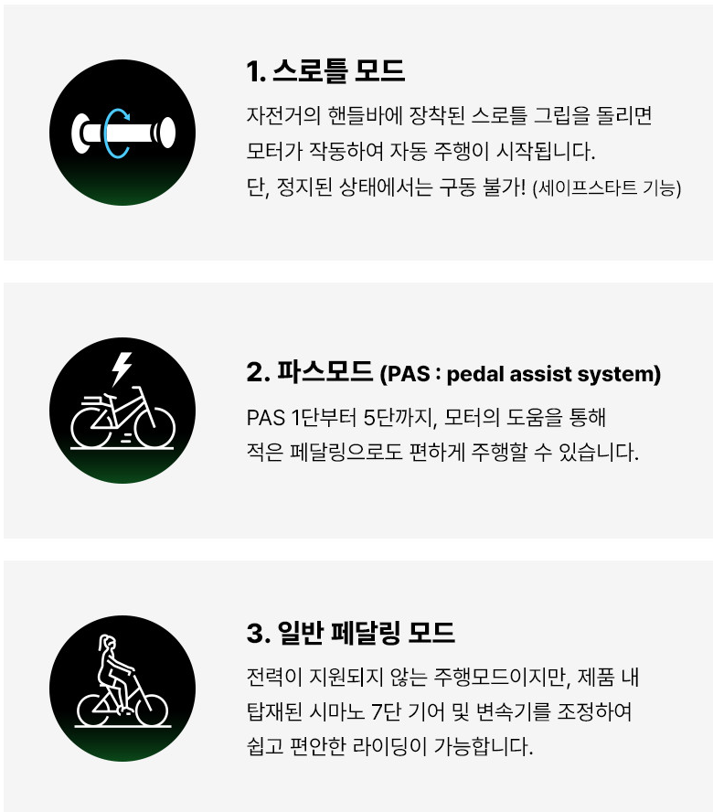 처음에 언급했듯 스로틀 모드, 파스 모드의 2가지와 일반 자전거와 같이 전력지원없이 작동되는 페달링 모드의 3가지 주행 모드를 제공합니다. 스로틀 모드의 경우 반드시 운전면허가 필요하다는 점도 꼭 참고하시길 바랍니다.