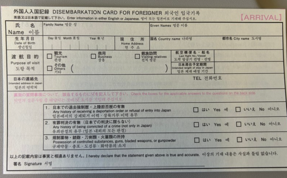결론부터 말씀드리자면 안됩니다. 현재 기준으로는 일본의 주요 국제공항 - 하네다, 나리타, 오사카(간사이), 후쿠오카, 오키나와(나하), 삿포로(신치토세), 나고야(주부) 등에서만 사용이 가능합니다. 일본 여객 항만에서는 사용 불가능하며, 선박으로 입국할 경우 기존대로 종이 신고서를 작성해서 입국심사와 세관검사를 받아야 합니다. 종이 입국 심사서에는 일본에서 묵는 호텔 주호와 전화번호, 도착하는 편명이 꼭 필요하니 참고하시길 바랍니다. 항공편을 이용한 경우도 마찬가지니 참고해주세요.