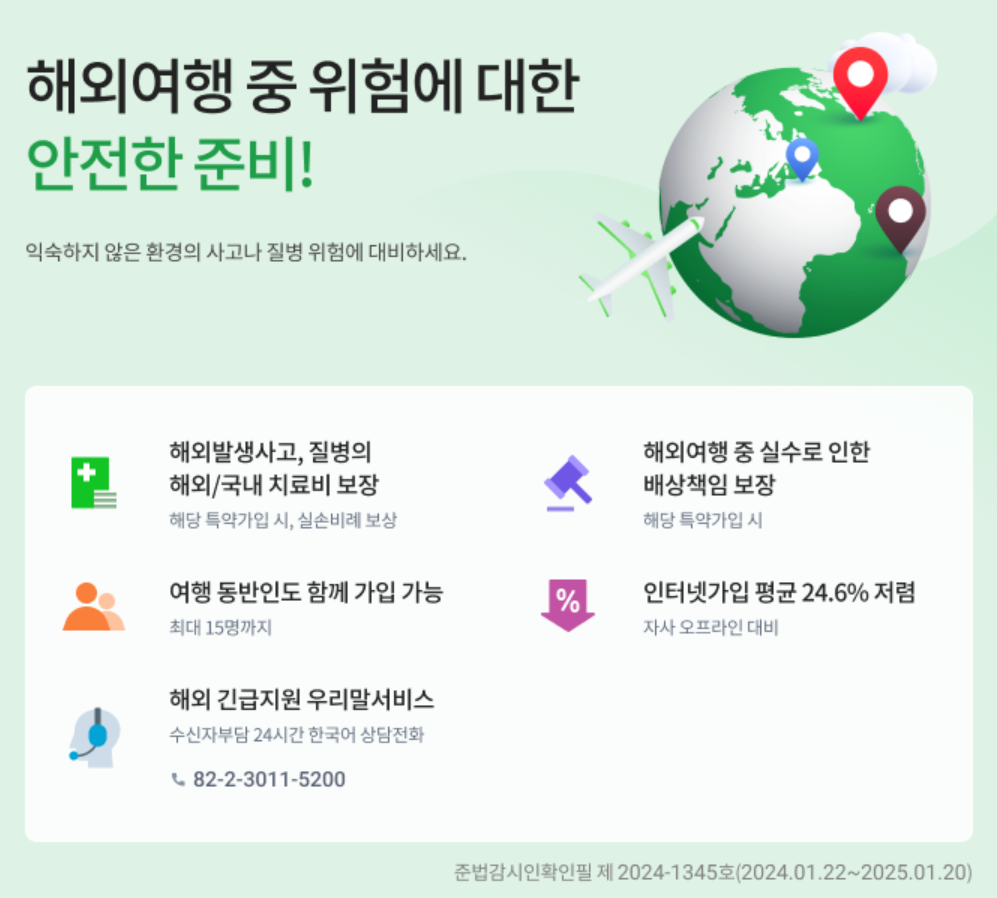 해외여행 중 다치거나 휴대품 도난사고 시 보장하며, 해외여행 중 발생한 진찰, 수술, 입원비 등 해외의료비 보장합니다. 도난이나 파손 등 우연한 사고로 인한 휴대품 손해 보장하는 특약에 가입할 수 있습니다.